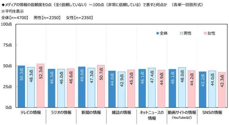 男女別にみると、平均が最も高くなったのは男性・女性とも「テレビの情報」(男性48.3点、女性52.3点)で、男性では「動画サイトの情報(YouTubeなど)」(48.0点)、女性では「新聞の情報」(50.7点)が続きました。