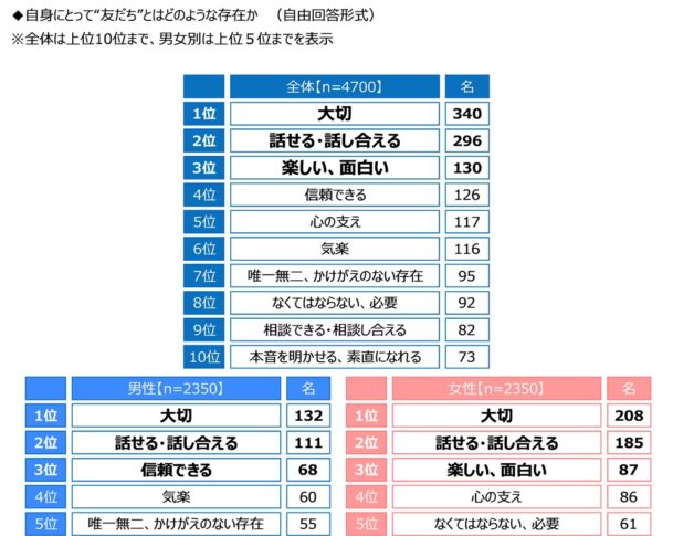 20代にとって友だちとは? 男女とも1位「大切」、2位「話せる・話し合える」、