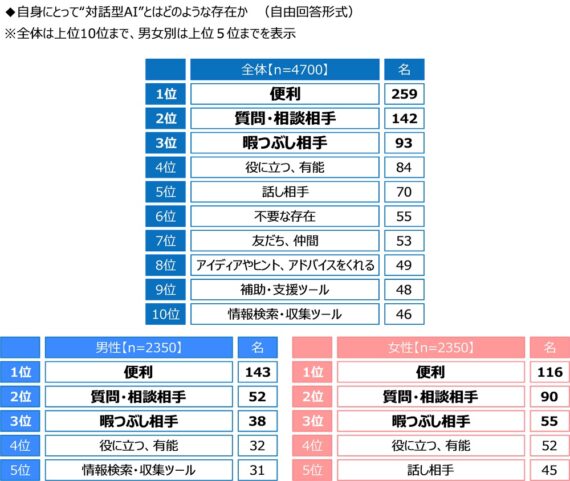 男女別にみると、男女とも1位「便利」(男性143名、女性116名)、2位「質問・相談相手」(男性52名、女性90名)、3位「暇つぶし相手」(男性38名、女性55名)となりました。