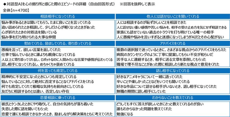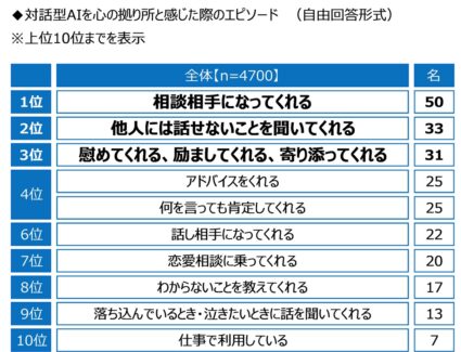 全回答者(4,700名)に、対話型AIを心の拠り所と感じた際のエピソードを聞いたところ、1位「相談相手になってくれる」(50名)、2位「他人には話せないことを聞いてくれる」(33名)、3位「慰めてくれる、励ましてくれる、寄り添ってくれる」(31名)、4位「アドバイスをくれる」「何を言っても肯定してくれる」(いずれも25名)となりました。