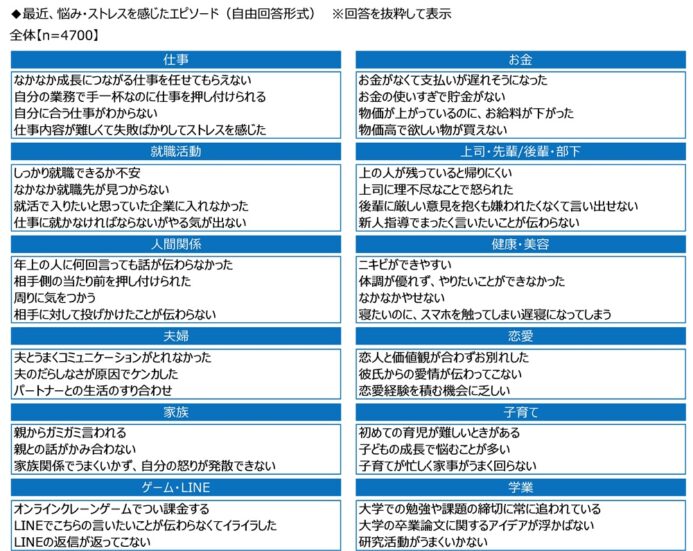 全回答者(4,700名)に、最近、悩み・ストレスを感じたエピソードを聞いたところ、仕事関連では「なかなか成長につながる仕事を任せてもらえない」や「仕事内容が難しくて失敗ばかりしてストレスを感じた」、お金関連では「お金がなくて支払いが遅れそうになった」や「物価高で欲しい物が買えない」、就職活動関連では「就活で入りたいと思っていた企業に入れなかった」や「仕事に就かなければならないがやる気が出ない」、上司・先輩/後輩・部下関連では「上司に理不尽なことで怒られた」や「新人指導でまったく言いたいことが伝わらない」、人間関係関連では「年上の人に何回言っても話が伝わらなかった」や「周りに気をつかう」といった回答がありました。