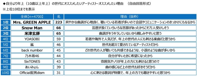TOP5について、オススメしたい理由をみると、1位の「Mrs. GREEN APPLE」では「爽やかな曲調が心地良く、聴いている若者が多いので会話やコミュニケーションのきっかけにもなるから」、2位の「Snow Man」では「芸歴が長くていろいろな苦節があったからこそ万人受けしそう」、3位の「米津玄師さん」では「曲調がキラキラしていないから親しみやすいと思う」といった回答がありました。また、4位の「YOASOBI」では「若者や海外で人気だが、年上の世代の人にも刺さる楽曲だと思うから」、5位の「嵐」では「世代を超えて愛されているアーティストだから」といった理由が挙げられました。