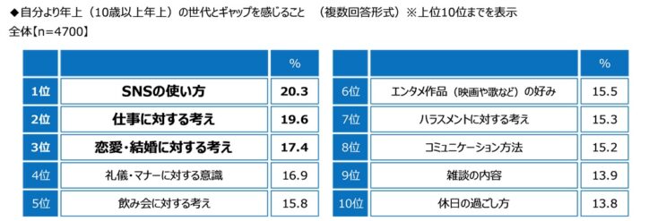 年上の年代に感じる世代間ギャップ 1位「SNSの使い方」