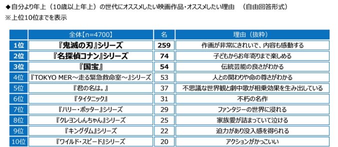 TOP5となった回答について、オススメしたい理由をみると、1位の「『鬼滅の刃』シリーズ」では「作画が非常にきれいで、内容も感動する」、2位の「『名探偵コナン』シリーズ」では「子どもからお年寄りまで楽しめる」、3位の「国宝」では「伝統芸能の良さがわかる」、4位の「『TOKYO MER~走る緊急救命室~』シリーズ」では「人との関わりや命の尊さがわかる」、5位「君の名は。」では「不思議な世界観と劇中歌が相乗効果を生み出している」といった回答がありました。