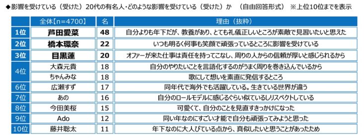 全回答者(4,700名)に、影響を受けている(受けた)20代の有名人を聞いたところ、1位は「芦田愛菜さん」となりました。回答した理由については、「自分よりも年下だが、教養があり、とても礼儀正しいところが素敵で見習いたいと思えた」などが挙げられました。勉強熱心な姿勢に影響を受けた人が多いようです。次いで、2位「橋本環奈さん」、3位「目黒蓮さん」、4位「大森元貴さん」「ちゃんみなさん」となりました。