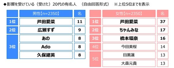 男女別にみると、男性・女性ともに1位は「芦田愛菜さん」となり、男性では2位「広瀬すずさん」、3位「あのさん」「Adoさん」「久保建英さん」となりました。女性では2位「ちゃんみなさん」、3位「橋本環奈さん」となりました。20代の女性では、2024年から2025年にかけて配信され人気となった、オーディション番組での活躍が大きな話題となった「ちゃんみなさん」への支持が厚いようです。