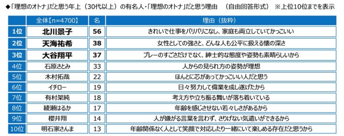 男女別にみると、男性では1位「大谷翔平さん」、2位「木村拓哉さん」、3位「イチローさん」となり、女性では1位「北川景子さん」、2位「天海祐希さん」、3位「石原さとみさん」となりました。