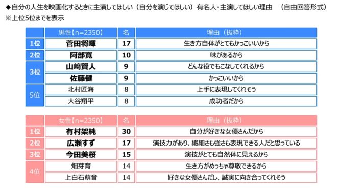 自分の人生を映画化するときに主演してほしい(自分を演じてほしい)有名人を聞いたところ、男性では1位「菅田将暉さん」となり、以降、2位「阿部寛さん」、3位「山﨑賢人さん」「佐藤健さん」、5位「北村匠海さん」「大谷翔平さん」が続きました。