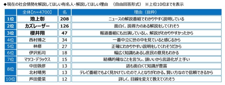 理由をみると、1位の「池上彰さん」では「ニュースの解説番組でわかりやすく説明している」、2位の「カズレーザーさん」では「面白く、説得力のある解説をしてくれそう」、3位の「櫻井翔さん」では「報道番組にも出演しているし、解説がわかりやすかったから」、4位の「西村博之さん」では「一番中立に世の中を見ていると感じるから」、5位の「林修さん」では「正確にわかりやすい説明をしてくれそうだから」といった回答が挙げられました。20代では、社会情勢に関する、わかりやすい解説や正確性の高い情報を求めている人が多いのではないでしょうか。