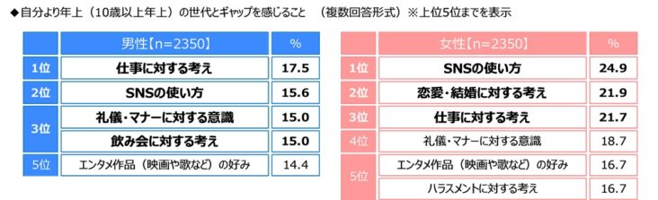男女別にみると、男性では1位「仕事に対する考え」(17.5%)、2位「SNSの使い方」(15.6%)、3位「礼儀・マナーに対する意識」「飲み会に対する考え」(いずれも15.0%)でした。一方、女性では1位「SNSの使い方」(24.9%)、2位「恋愛・結婚に対する考え」(21.9%)、3位「仕事に対する考え」(21.7%)となりました。また、女性では「ハラスメントに対する考え」(16.7%)もTOP5にランクインしました。