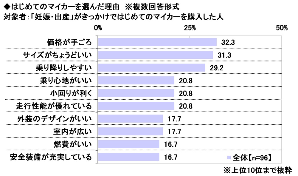 ここで、「妊娠・出産」がきっかけではじめてのマイカーを購入した方(96名)の回答をみると、1位は「価格が手ごろ」(32.3%)、2位は「サイズがちょうどいい」(31.3%)、3位は「乗り降りしやすい」(29.2%)で、「乗り降りしやすい」は全体と比べて14.4ポイント高くなりました。妊娠中や子ども連れのドライブで、スムーズに乗り降りできる車を選んだ方が多いのではないでしょうか。