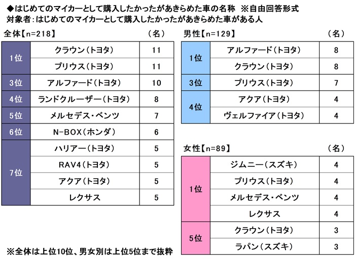 はじめてのマイカーとして購入したかったがあきらめた車がある方218名に、購入をあきらめた車の名称を聞いたところ、1位「クラウン(トヨタ)」「プリウス(トヨタ)」(いずれも11名)、3位「アルファード(トヨタ)」(10名)、4位「ランドクルーザー(トヨタ)」(8名)、5位「メルセデス・ベンツ」(7名)となりました。