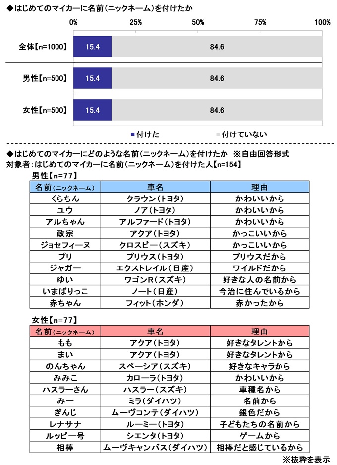 「はじめてのマイカーにニックネームを付けた」15.4%