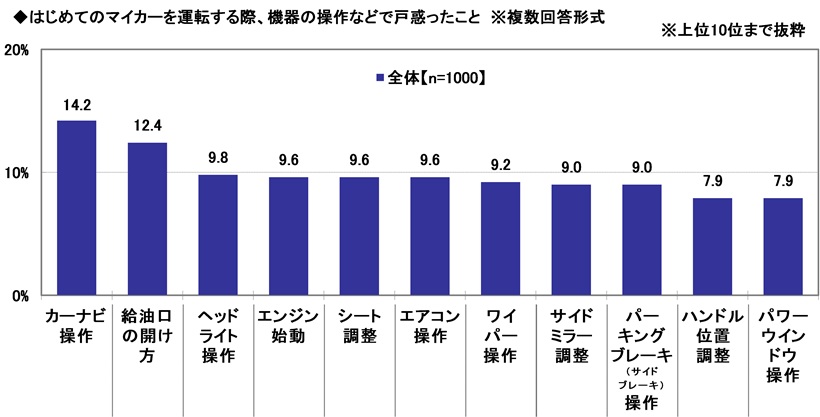 全回答者1,000名に、はじめてのマイカーを運転する際、機器の操作などで戸惑ったことを聞いたところ、「カーナビ操作」(14.2%)が最も多く、「給油口の開け方」(12.4%)、「ヘッドライト操作」(9.8%)、「エンジン始動」「シート調整」「エアコン操作」(いずれも9.6%)が続きました。