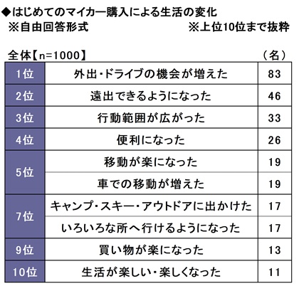 TOP3は「外出・ドライブの機会が増えた」「遠出できるようになった」「行動範囲が広がった」