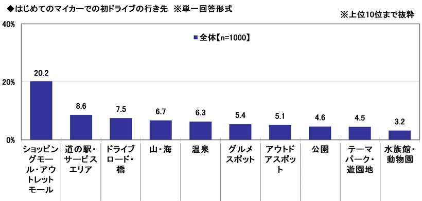 全回答者1,000名に、はじめてのマイカーで初ドライブに行った場所を聞いたところ、「ショッピングモール・アウトレットモール」(20.2%)が最も多く、「道の駅・サービスエリア」(8.6%)、「ドライブロード・橋」(7.5%)、「山・海」(6.7%)、「温泉」(6.3%)が続きました。