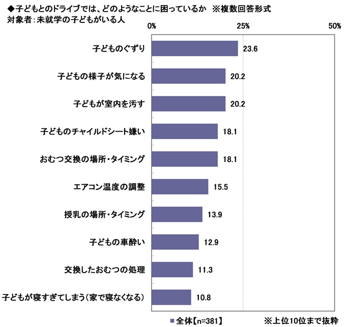 また、未就学の子どもがいる方381名に、子どもとのドライブでどのようなことに困っているかを聞いたところ、「子どものぐずり」(23.6%)が最も多く、「子どもの様子が気になる」「子どもが室内を汚す」(いずれも20.2%)、「子どものチャイルドシート嫌い」「おむつ交換の場所・タイミング」(いずれも18.1%)が続きました。