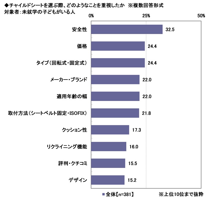 未就学の子どもがいる方381名に、チャイルドシートを選ぶ際、どのようなことを重視したかを聞いたところ、「安全性」(32.5%)が最も多くなりました。子どもの命を守るために十分な安全性を備えていることが欠かせないと考えている方が多いのではないでしょうか。次いで、「価格」「タイプ(回転式・固定式)」(いずれも24.4%)、「メーカー・ブランド」「適用年齢の幅」(いずれも22.0%)となりました。