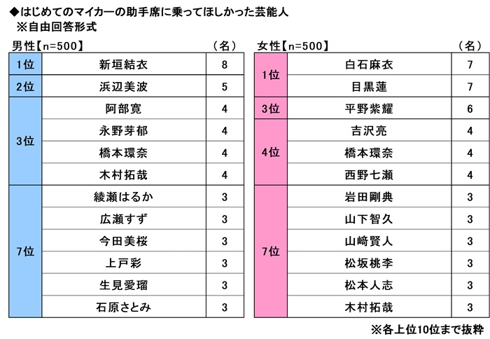 全回答者1,000名に、はじめてのマイカーの助手席に乗ってほしかった芸能人を聞いたところ、男性回答では1位「新垣結衣さん」(8名)、2位「浜辺美波さん」(5名)、3位「阿部寛さん」「永野芽郁さん」「橋本環奈さん」「木村拓哉さん」(いずれも4名)、女性回答では1位「白石麻衣さん」「目黒蓮さん」(いずれも7名)、3位「平野紫耀さん」(6名)、4位「吉沢亮さん」「橋本環奈さん」「西野七瀬さん」(いずれも4名)となりました。