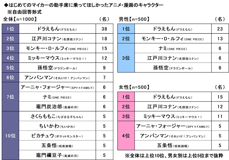 また、はじめてのマイカーの助手席に乗ってほしかったアニメ・漫画のキャラクターを聞いたところ、1位「ドラえもん(ドラえもん)」(38名)、2位「江戸川コナン(名探偵コナン)」(18名)、3位「モンキー・D・ルフィ(ONE PIECE)」(15名)、4位「ミッキーマウス(ミッキーマウス!)」(12名)、5位「孫悟空(ドラゴンボール)」(9名)となりました。