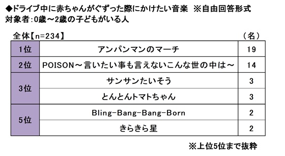 0歳~2歳の子どもがいる方234名に、ドライブ中に赤ちゃんがぐずった際にかけたい音楽を聞いたところ、1位「アンパンマンのマーチ」(19名)、2位「POISON~言いたい事も言えないこんな世の中は~」(14名)となりました。