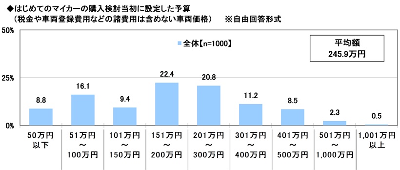 全回答者1,000名に、はじめてのマイカーの購入検討当初に設定した予算(税金や車両登録費用などの諸費用は含めない車両価格)を聞いたところ、「151万円~200万円」(22.4%)や「201万円~300万円」(20.8%)に回答が集まり、平均は245.9万円でした。
