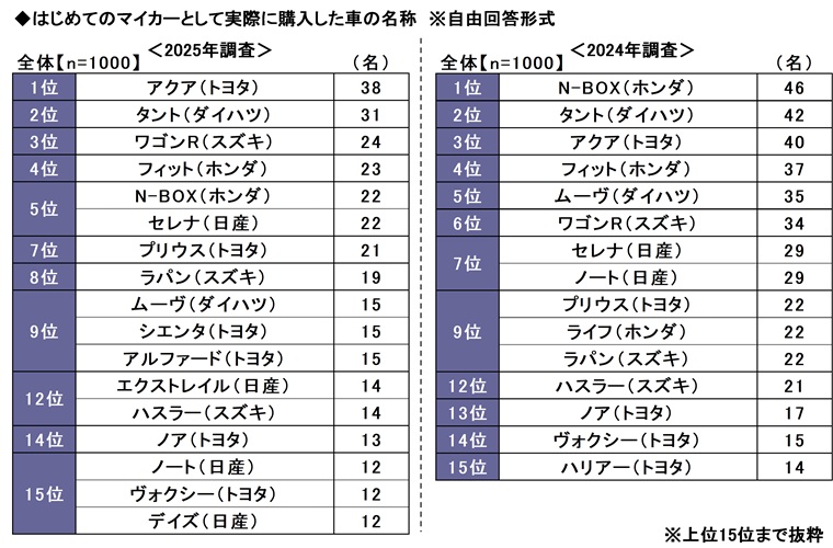 昨年の調査結果(※2)と比較すると、「アクア(トヨタ)」は2024年3位から順位を上げ、2025年は1位となりました。