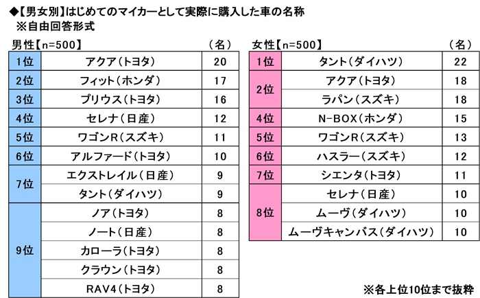 全回答者1,000名に、はじめてのマイカーとして実際に購入した車の名称を聞いたところ、1位「アクア(トヨタ)」(38名)、2位「タント(ダイハツ)」(31名)、3位「ワゴンR(スズキ)」(24名)、4位「フィット(ホンダ)」(23名)、5位「N-BOX(ホンダ)」「セレナ(日産)」(いずれも22名)となりました。