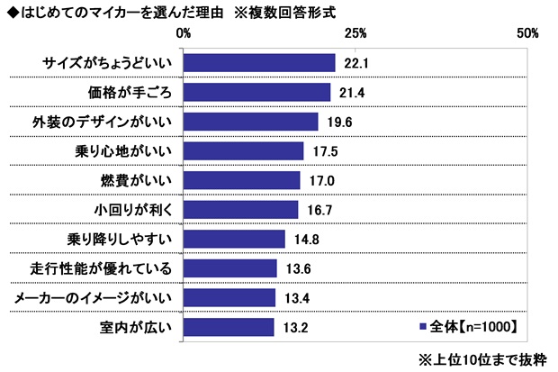 続いて、はじめてのマイカーを選んだ理由を聞いたところ、1位「サイズがちょうどいい」(22.1%)、2位「価格が手ごろ」(21.4%)、3位「外装のデザインがいい」(19.6%)となりました。