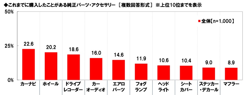全回答者(1,000名)に、これまでに購入したことがあるパーツ・アクセサリーを聞いたところ、【純正パーツ・アクセサリー(※)】では「カーナビ」(22.6%)が最も高くなり、「ホイール」(20.2%)、「ドライブレコーダー」(18.6%)、「カーオーディオ」(16.0%)、「エアロパーツ」(14.6%)が続きました。