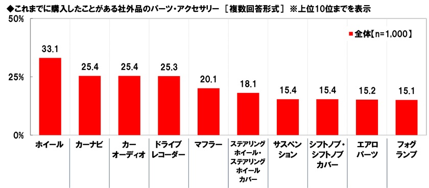 【社外品のパーツ・アクセサリー(※)】では「ホイール」(33.1%)が最も高くなり、「カーナビ」「カーオーディオ」(いずれも25.4%)、「ドライブレコーダー」(25.3%)、「マフラー」(20.1%)が続きました。