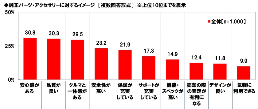 パーツ・アクセサリーに対するイメージを聞いたところ、【純正パーツ・アクセサリー】では「安心感がある」(30.8%)が最も高くなり、「品質が良い」(30.3%)、「クルマと一体感がある」(29.5%)、「安全性が高い」(23.2%)、「保証が充実している」(21.9%)が続きました。