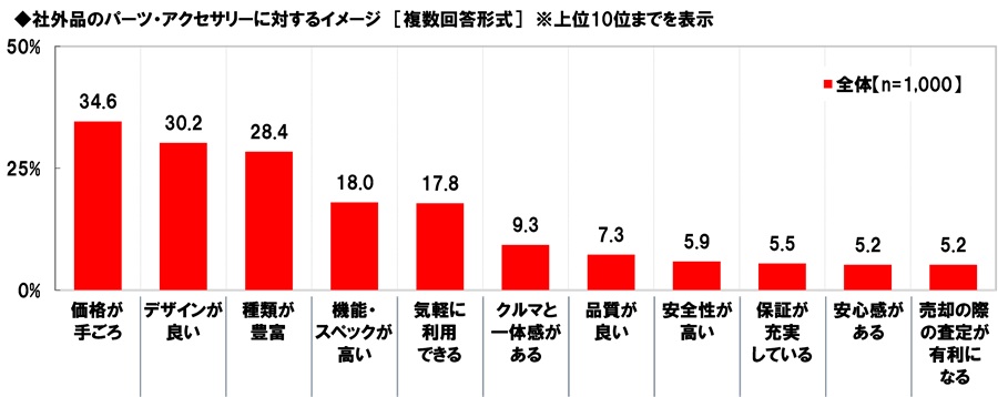 【社外品のパーツ・アクセサリー】では「価格が手ごろ」(34.6%)が最も高くなりました。純正品よりも安価に購入できると感じている人が多いようです。次いで高くなったのは、「デザインが良い」(30.2%)、「種類が豊富」(28.4%)、「機能・スペックが高い」(18.0%)、「気軽に利用できる」(17.8%)でした。