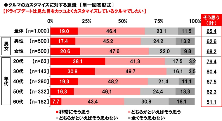 「ドライブデートは見た目をカッコよくカスタマイズしているクルマでしたい」65%、30代では80%