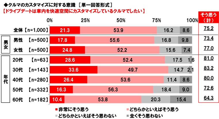 また、【ドライブデートは車内を快適空間にカスタマイズしているクルマでしたい】では『そう思う(計)』は75.2%となりました。