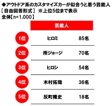 アウトドア系のカスタマイズカーが似合うと思う芸能人を聞いたところ、1位「ヒロミさん」、2位「所ジョージさん」、3位「ヒロシさん」となりました。
