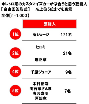 また、レトロ系のカスタマイズカーが似合うと思う芸能人を聞いたところ、「所ジョージさん」がダントツとなり、2位「ヒロミさん」「堺正章さん」と続きました。