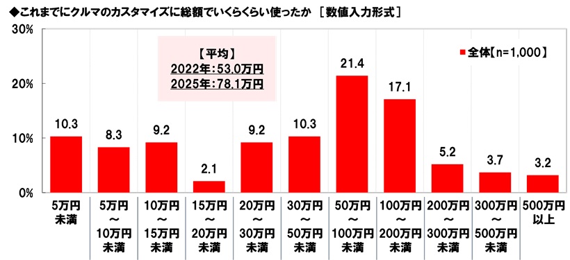 2022年の調査結果(※)と比較すると、クルマのカスタマイズに使った金額(総額)の平均は、2022年53.0万円→2025年78.1万円と25.1万円の増加となりました。
