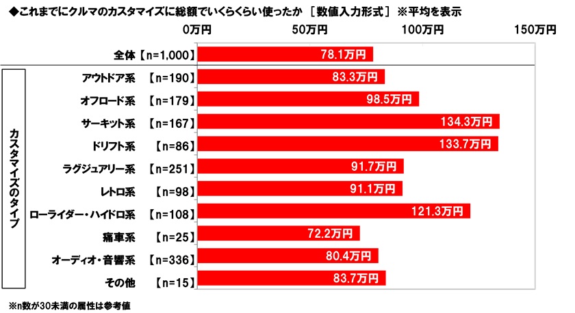 カスタマイズのタイプ別にみると、これまでにクルマのカスタマイズに使った金額(総額)の平均は、サーキット系(134.3万円)が最も高くなり、ドリフト系(133.7万円)、ローライダー・ハイドロ系(121.3万円)が続きました。