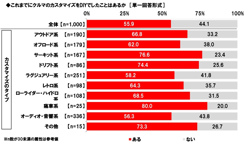 カスタマイズのタイプ別にみると、クルマのカスタマイズをDIYでしたことがある人の割合は、サーキット系(76.6%)とドリフト系(74.4%)が高くなりました。
