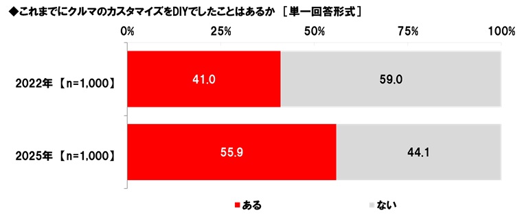2022年の調査結果と比較すると、クルマのカスタマイズをDIYでしたことがある人の割合は、2022年41.0%→2025年55.9%と14.9ポイントの上昇となりました。