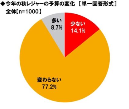 今年の秋レジャーの予算が昨年と比べて少ないか多いか聞いたところ、「変わらない」が77.2%で特に高くなり、「少ない」は14.1%、「多い」は8.7%でした。