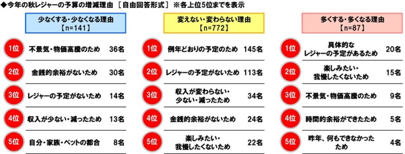 今年の秋レジャーの予算の増減の理由を聞いたところ、昨年と比べて【少ない】と回答した人(141名)では1位「不景気・物価高騰のため」、2位「金銭的余裕がないため」、3位「レジャーの予定がないため」、【変わらない】と回答した人(772名)では1位「例年どおりの予定のため」、2位「レジャーの予定がないため」、3位「収入が変わらない・少ない・減ったため」、【多い】と回答した人(87名)では1位「具体的なレジャーの予定があるため」、2位「楽しみたい・我慢したくないため」、3位「不景気・物価高騰のため」となりました。
