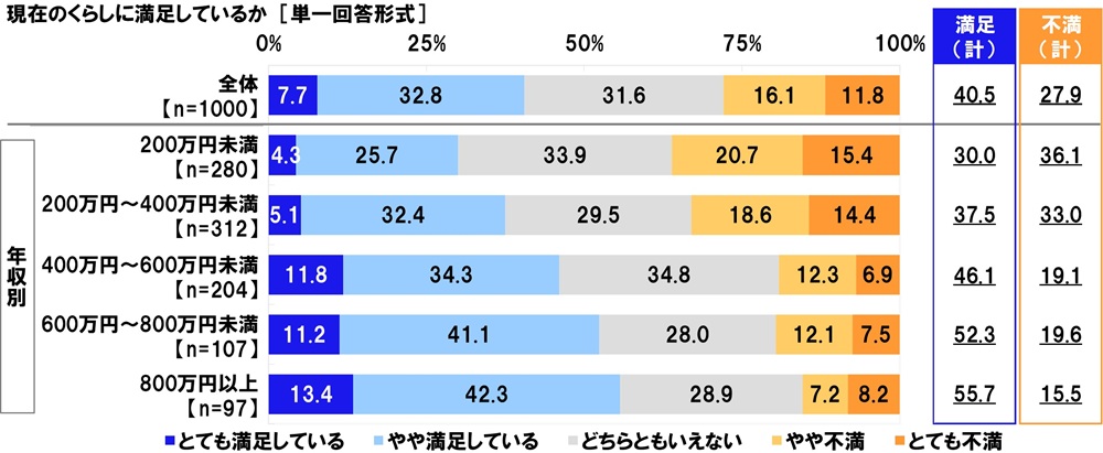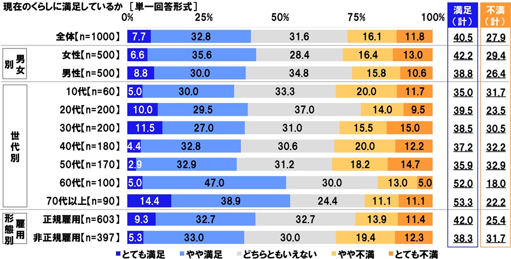 全回答者(1,000名)に、現在のくらしに満足しているか聞いたところ、「とても満足」は7.7%、「やや満足」は32.8%で、合計した「満足(計)」は40.5%、「とても不満」は11.8%、「やや不満」は16.1%で、合計した「不満(計)」は27.9%、「どちらともいえない」は31.6%となりました。