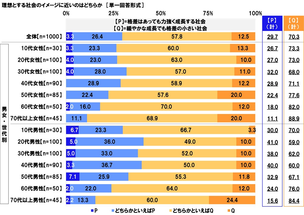 全回答者(1,000名)に、社会の成長について、【格差はあっても力強く成長する社会】と【緩やかな成長でも格差の小さい社会】のどちらが理想とする社会のイメージに近いか聞いたところ、【緩やかな成長でも格差の小さい社会】が70.3%と多数派となりました。