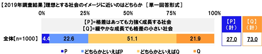 過去の調査結果と比較すると、【格差はあっても力強く成長する社会】は2019年調査では27.0%、【緩やかな成長でも格差の小さい社会】は2019年調査では73.0%となっており、大きな変化はみられませんでした。
