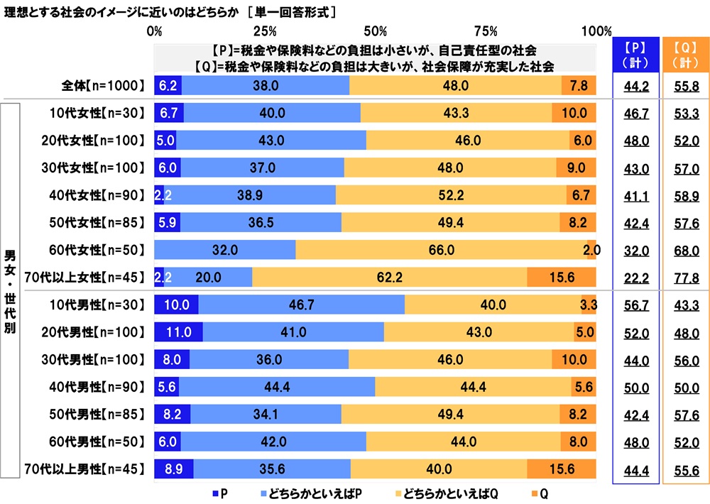 男女・世代別にみると、女性では高年層で、【税金や保険料などの負担は大きいが、社会保障が充実した社会】(60代女性68.0%、70代以上女性77.8%)が突出して高くなる傾向がみられました。男性では、20代以下で【税金や保険料などの負担は小さいが、自己責任型の社会】(10代男性56.7%、20代52.0%)が多数派、40代では【税金や保険料などの負担は小さいが、自己責任型の社会】と【税金や保険料などの負担は大きいが、社会保障が充実した社会】(いずれも50.0%)が拮抗しました。