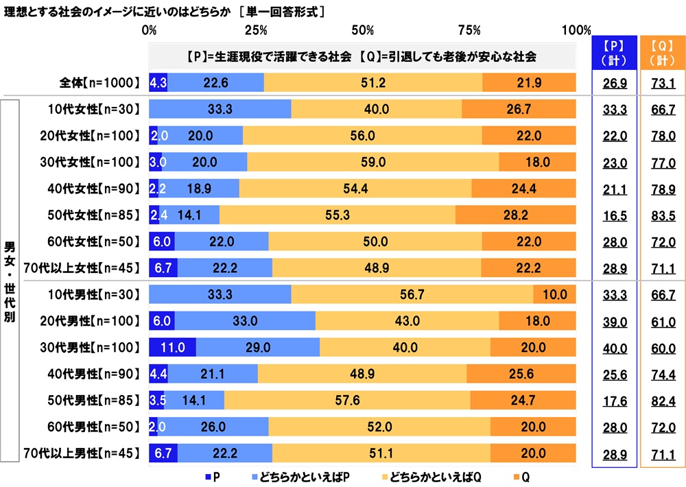 老後の生活について、【生涯現役で活躍できる社会】と【引退しても老後が安心な社会】のどちらが理想とする社会のイメージに近いか聞いたところ、【引退しても老後が安心な社会】が73.1%と多数派でした。