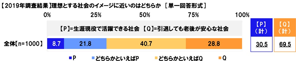過去の調査結果と比較すると、2019年調査では【生涯現役で活躍できる社会】は30.5%、【引退しても老後が安心な社会】は69.5%となっており、今回の調査では2019年調査とおおむね同様の傾向となりました。