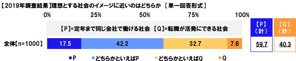 過去の調査結果と比較すると、2019年調査では、【定年まで同じ会社で働ける社会】が59.7%、【転職が活発にできる社会】が40.3%となっており、今回の調査では2019年の調査と同水準となりました。